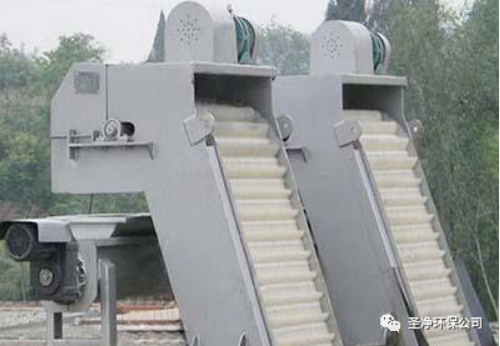 耙齒鏈運(yùn)轉(zhuǎn)到設(shè)備的上部時,由于槽輪和彎軌的導(dǎo)向,使每組耙齒之間產(chǎn)生相對自清運(yùn)動,絕大部分固體物質(zhì)靠重力落下。另一部分則依靠清掃器的反向運(yùn)動把粘在耙齒上的雜物清掃干凈。